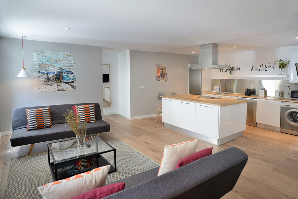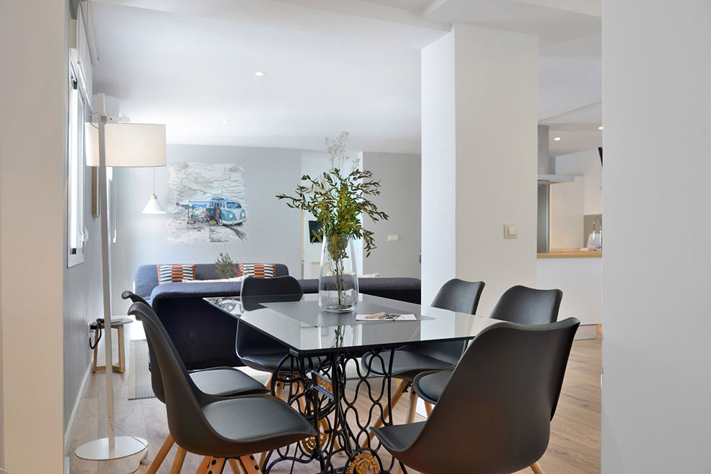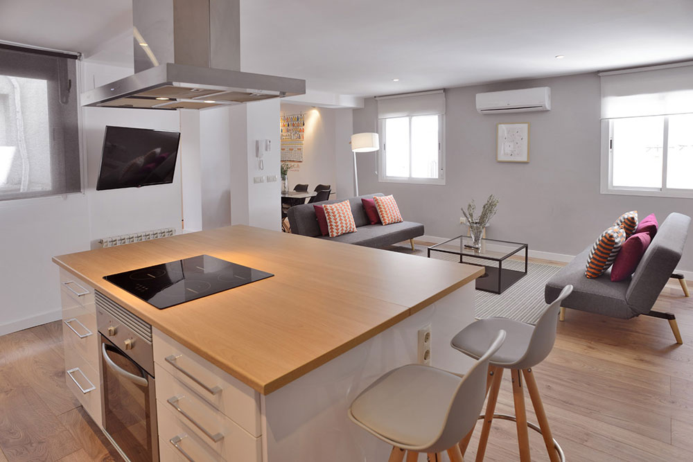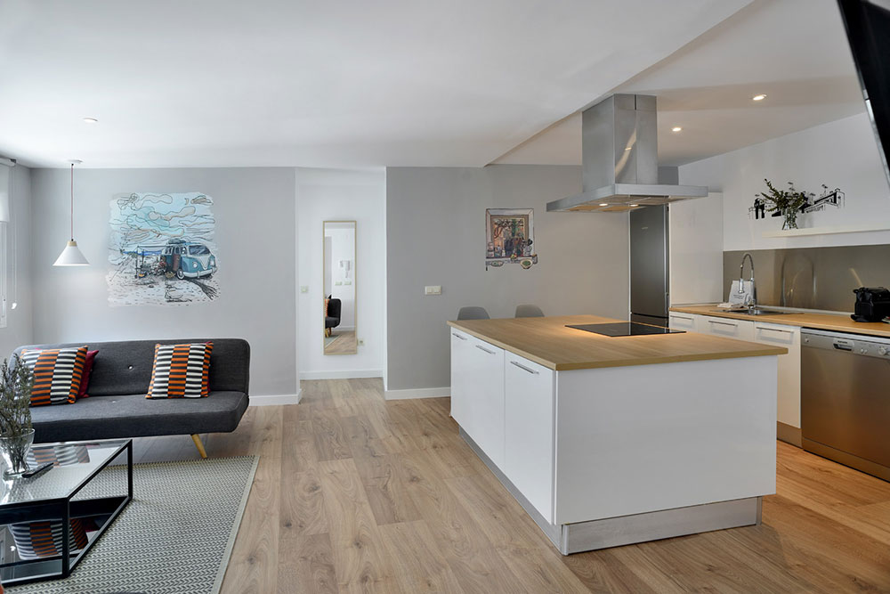 La idea era crear un espacio agradable y acogedor, que hiciera sentir al visitante que podría estar en su propia casa, para ellos se proyectan salones abiertos con la cocina integrada. Colocamos una tarima de lama ancha y color natural, que potencia la luz natural y decidimos resaltar el color en alguna pared del salón e instalar obra gráfica y vinilos de gran formato con mucha presencia que hacen muy alegre el espacio.