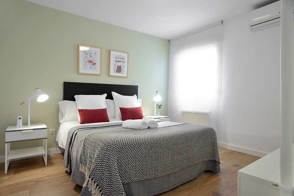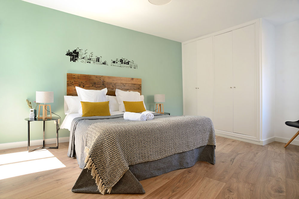 Los dormitorios se conciben con mobiliario neutro, ligero y moderno, con cabeceros de madera y lámparas de mesa cálidas. Se sustituyen las mesitas de noche por mesas auxiliares y se da color a la pared del cabecero, utilizando uno en cada dormitorio para que tengan su propia personalidad.
